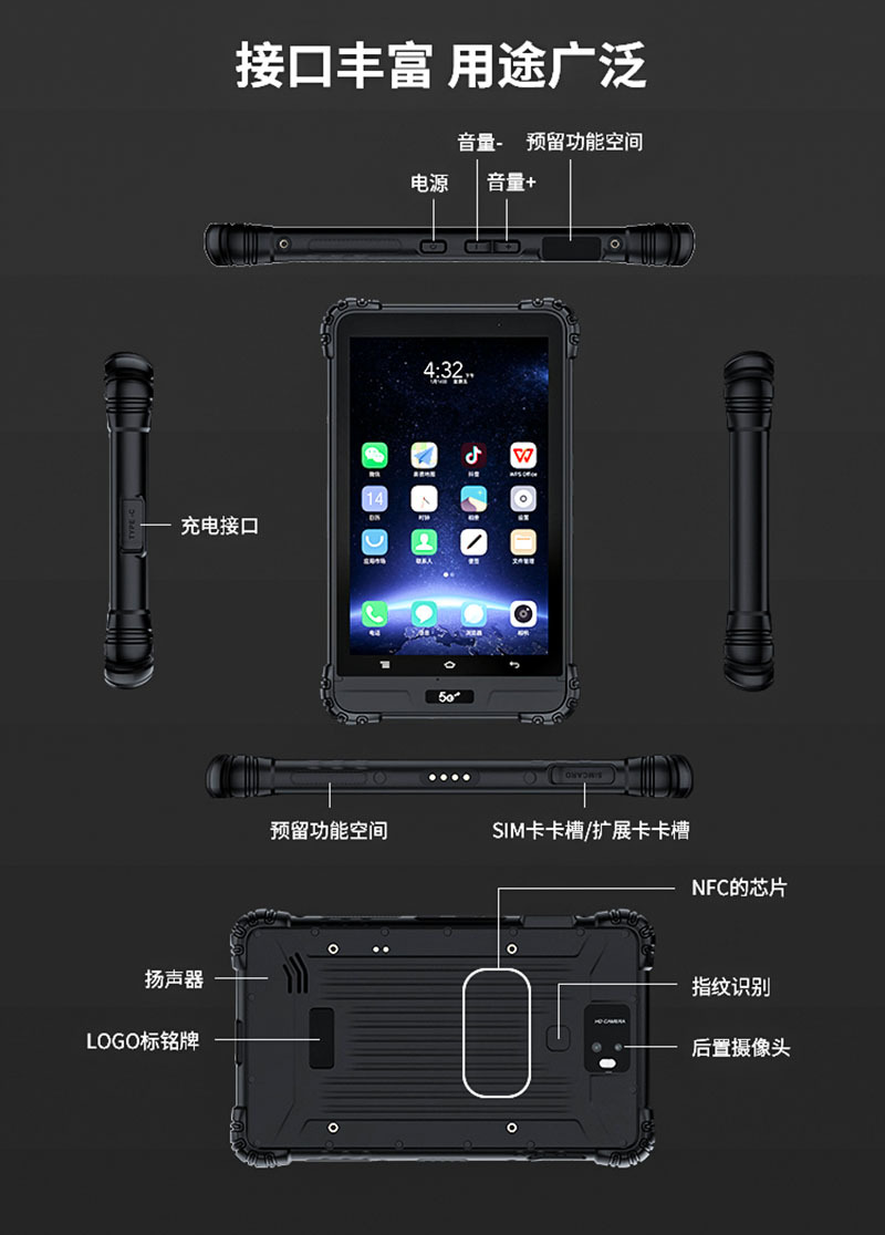 我司产品涵盖:4寸、5寸、5.5寸、5.7寸、6.X寸、7寸、8寸、10寸行业应用多功能/多接口三防平板电脑/手持终端,支持安卓或WINDOWS系统,可以选配各类功能,如:NFC、指纹模块、2D条码扫描、二代身-份-证模块、北斗、超高频RFID、Lora wifi,人脸识别、红外测温或红外抄表、高精度定-位、公网对讲或DMR数模对讲、专网、卫星通讯等,可以选择的接口有:USB母口、RJ45有线网口、RS232串口、DC口,TYPE-C USB口等。
