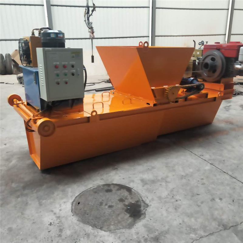 渠底衬砌机由上料机、摊匀机、抹平机、收面架四部分组成。上料机放置在渠坡上,机架与摊匀机机架连接,架底有行走轮,牵引,自动控制行走。摊匀机、抹平机、收面架平行放置在渠底、中间保持距离。物料由罐车放到上料机料斗内,随皮带送入摊匀机料斗,然后顺着摊匀机皮带送料,通过皮带上的挡料板将物料引入储料斗中,由机架下方振动板摊匀,在通过抹平机抹平,收面架人工收面