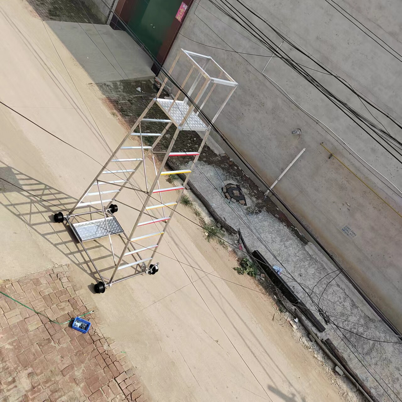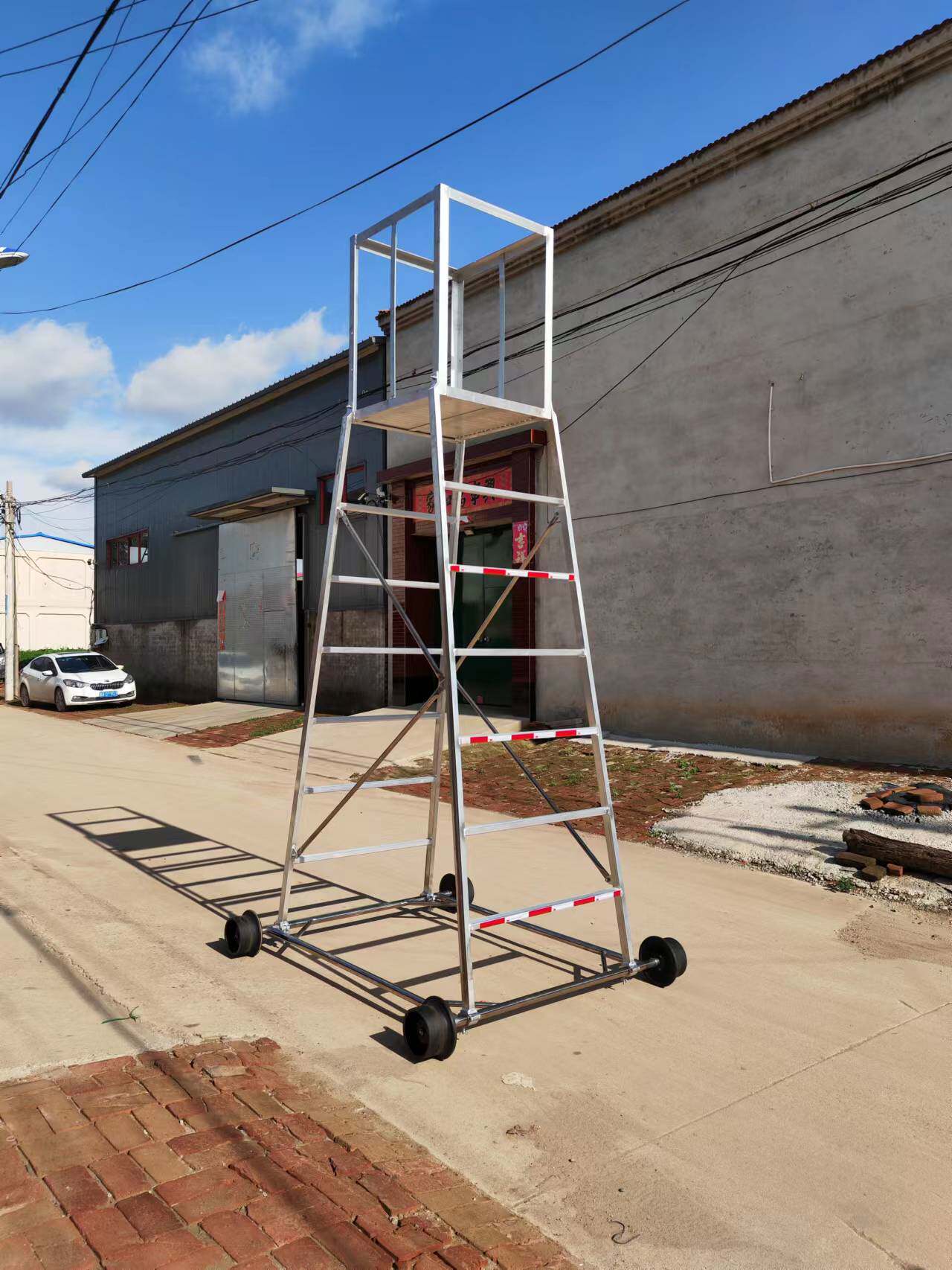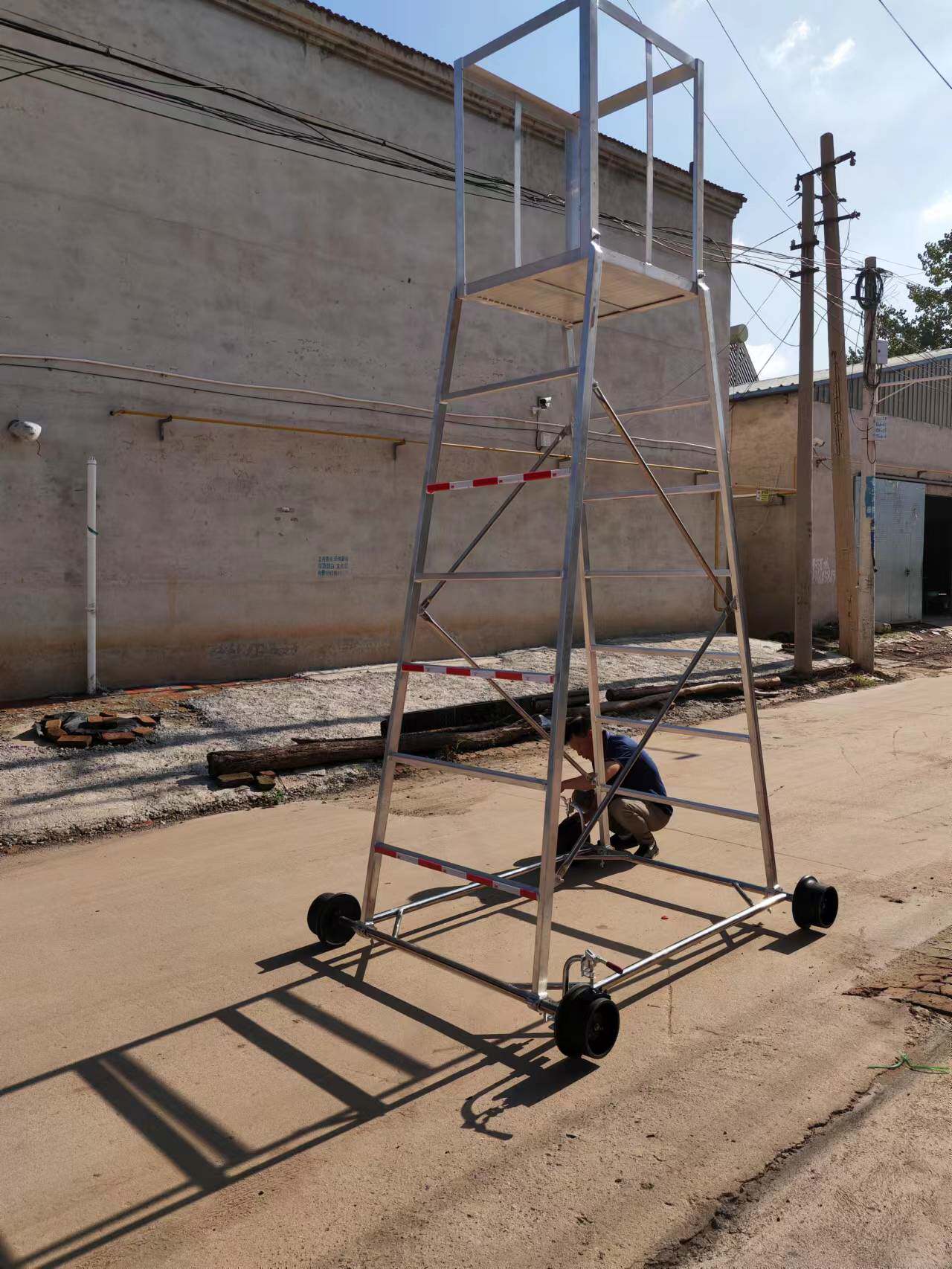 梯身及底架均可快速分解,便于搬迁。带有防制动器,既防倾倒,又便于在斜道上作业。工作台可以调节高度,三挡调节, 便于运输梯车高度用户可根据情况自行确定。
