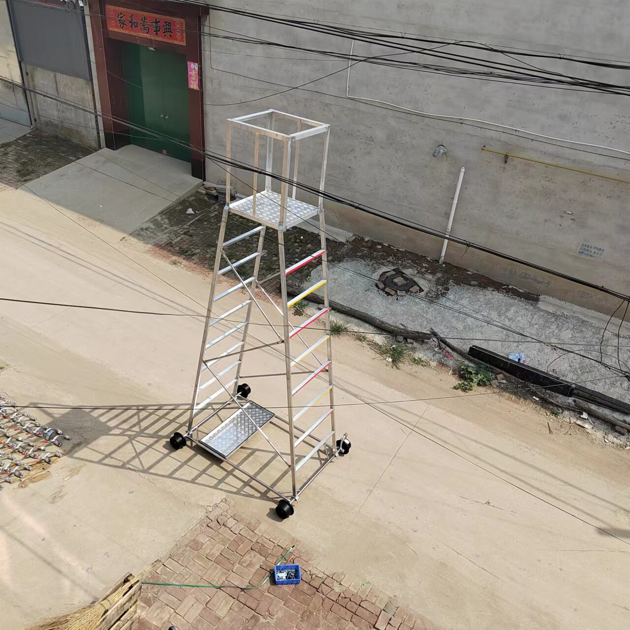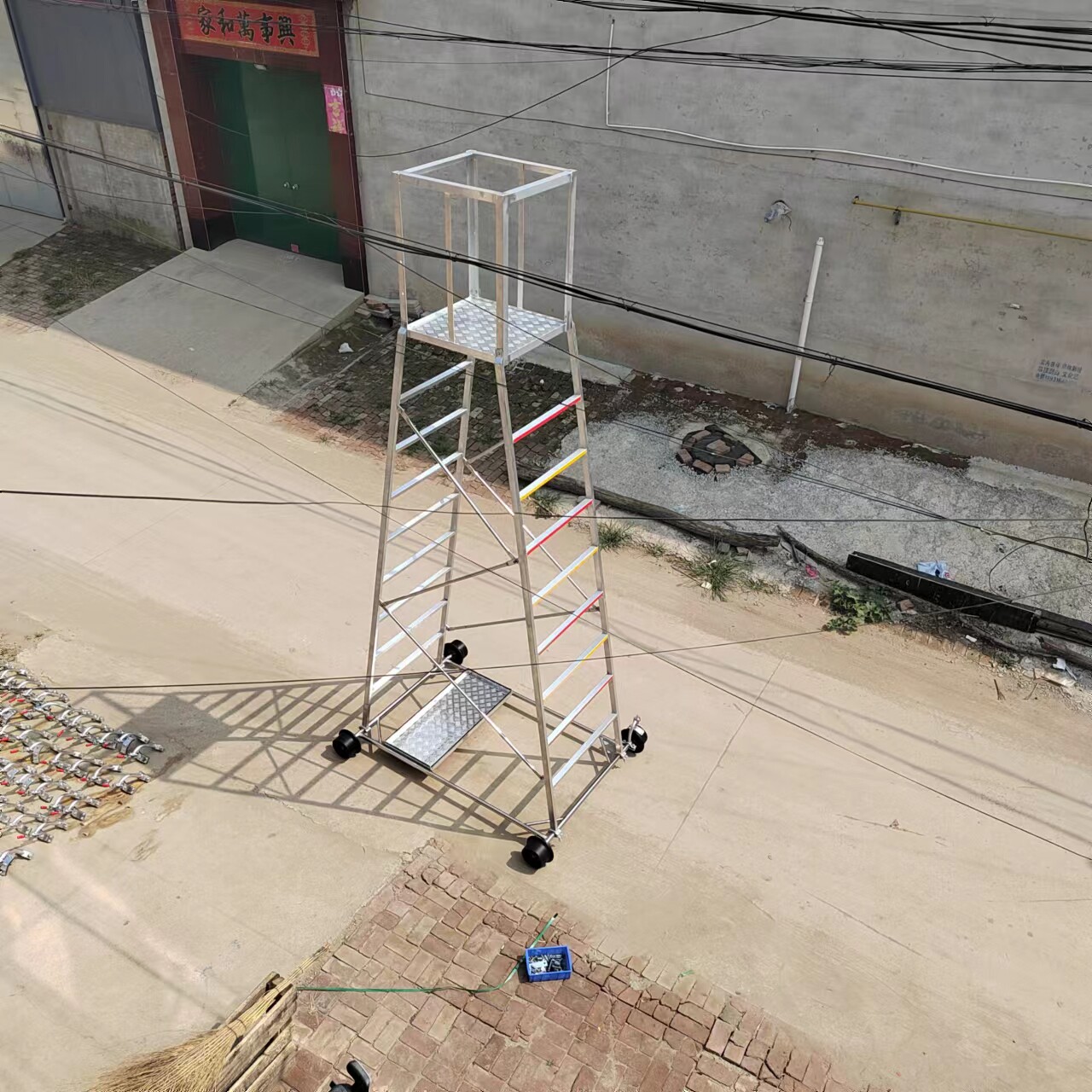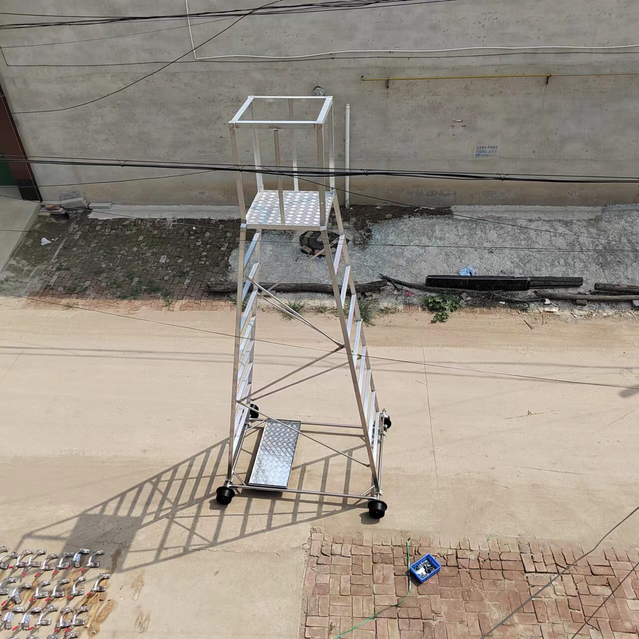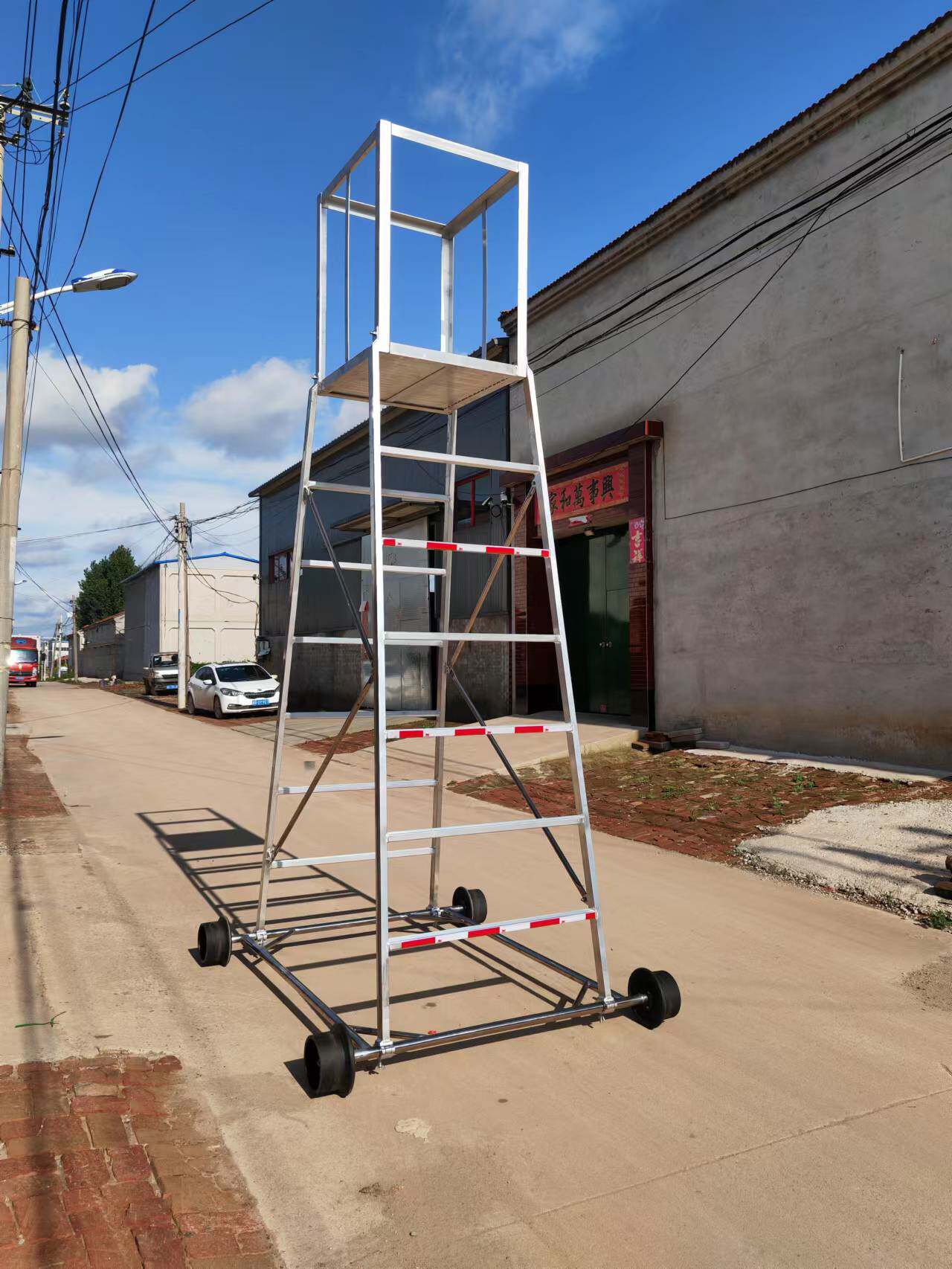 梯身及底架均可快速分解,便于搬迁。带有防制动器,既防倾倒,又便于在斜道上作业。工作台可以调节高度,三挡调节, 便于运输梯车高度用户可根据情况自行确定。