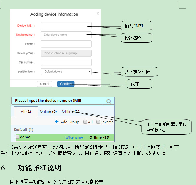 1.车载防盗器,摩托车,小汽车,电动车,(8-40V) 2. 基站+GPS实时 防水等级IP67 时间休眠,振动休眠,深度振动休眠,定时报告,多重省电模式 3.移位,电子栅栏,超速,ACC,振动,外电断电,低电报警。 4.自带内存可存储16000个位置信息, 手机短信带GOOGLE地图链接,文字地理位置查询 5. 网页版平台,免费PC安装软件,手机客户端 短信/APP,布防撤防