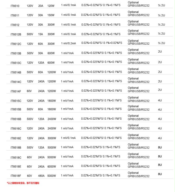 IT8500系列(120~5000W)在具有极佳性价比的同时具备多种操作模式和测试功能,具备可编程List输出模式,定电压、定功率、定电流、定电阻模式,远端测量、短路测试、电池测试、动态测试功能,满足客户多元化的测试需求。该系列可0~500V工作,具备良好的低电压带载特性。该系列所有型号均为标准体积,可以配合IT-253键盘快速完成产品测试,提供高效率、高精度的测试解决方案。该系列可选配USB/RS232/GPIB通讯接口。